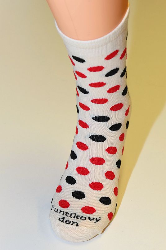 Stylové, pohodlné, s vysokým podílem bavlny a jasným poselstvím – takové jsou krémové ponožky s červenými a černými puntíky, které jsme vytvořili speciálně pro Puntíkový den. Na špičce je zdobí nápis „Puntíkový den“ jako symbol sounáležitosti s lidmi žijícími s lupénkou.